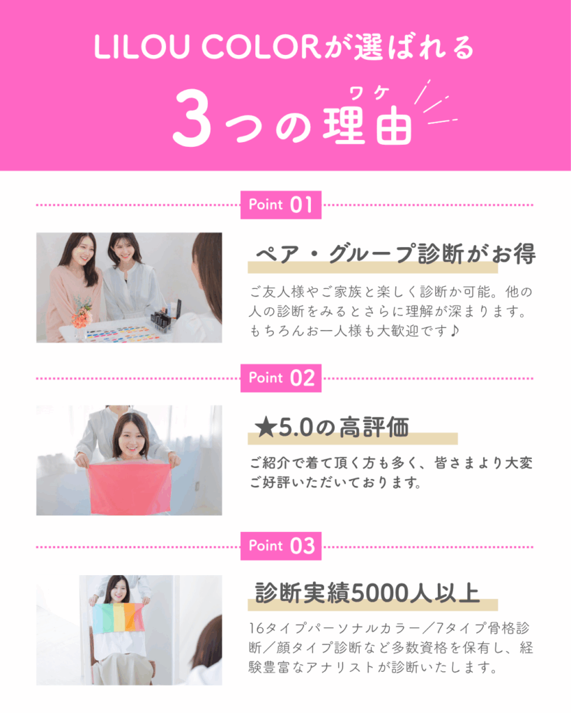 完全個室のプライベートサロンのため、他のお客様との接触もございません。経験豊富なアナリストが、あなたらしさを大切にしながら診断を行います。16タイプパーソナルカラー/骨格診断/顔タイプ診断を通じて、「似合う」が分かる丁寧なカウンセリングが好評です。お友達と一緒のペア診断も大歓迎♪新しい発見を楽しみながら、もっと自信を持てる毎日を叶えてみませんか?